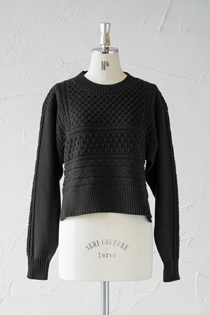 ケーキのようなアラン柄をイメージしたニットプルオーバー。 アラン編みをタテヨコに組み合わせた、柄配置が楽しいローゲージニットです。