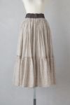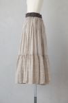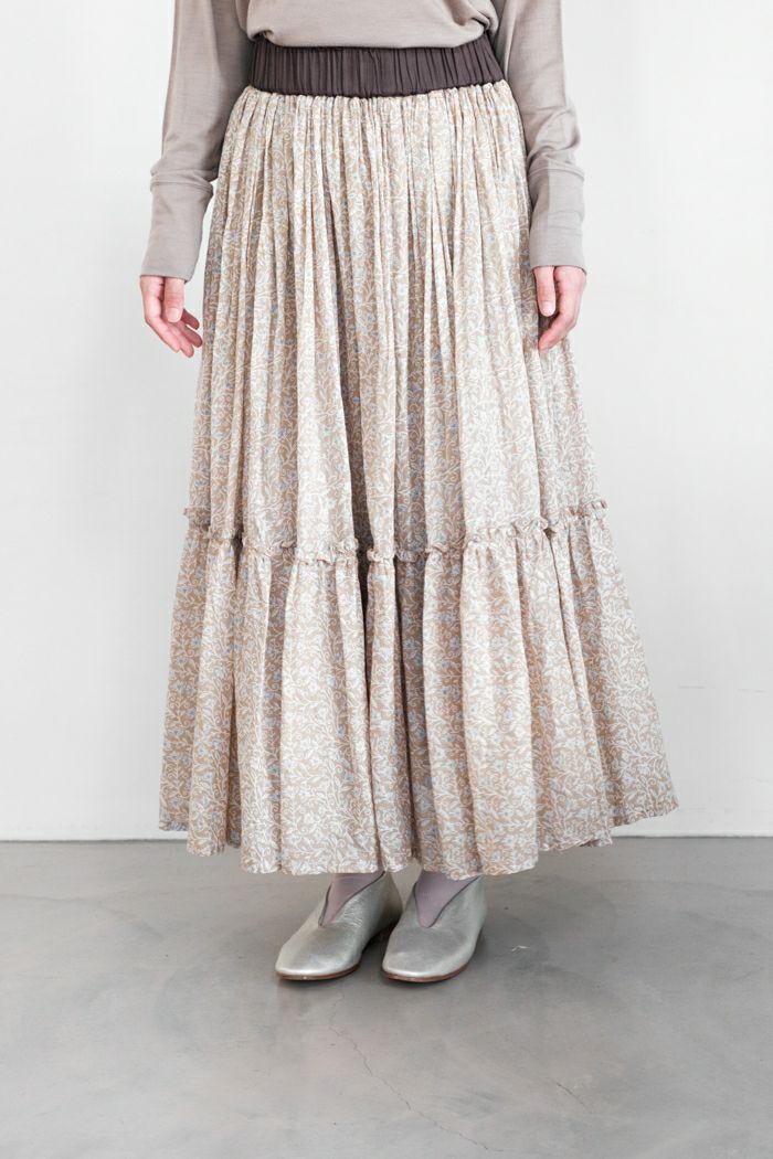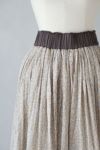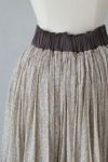 ふんわりと空気を纏っているようなたっぷり生地を使用したギャザースカート。 さりげなくキラッと光るラメ糸がライン状に織り込まれた繊細な奥行きのある生地感が魅力です。 インドの昔ながらの手法である手捺染でのスクリーンプリントで一色一色、色を重ねてプリントされており、手仕事による温かさを感じることが出来ます。
