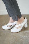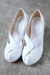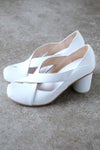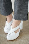 アッパーのクロスベルトが足元を細くすっきり見せてくれるヒールパンプス。FLAT APARTMENT 2016春夏のニューモデルです。全てオリジナル木型を使用しハンドメイドで作られており、主にイタリアから取り寄せる柔らかな皮革は、履くほどに足に馴染んできます。少しつま先の反り返った独特のフォルムが美しく、太い円柱の7cmヒールは、インパクトを与えながらも、安定感のある履き心地を実現してくれます。また、ヒールに同レザーを使用することで上品でエレガントな印象に仕上げています。