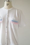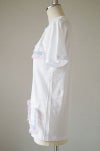 コーディネイトに役立つ白のカットソーカーディガン。 ポケット回りにフリンジ刺繍のブレードを付けたキュートなデザイン。フリンジはベビーピンク×ブルーの甘いカラーリングで。インパクトのある4ポケットです。花柄プリントのくるみボタンも可愛いアクセント。肌触りのよい柔らかなコットン天竺素材。ボタンを留めて着たり、前を開けて羽織ったり。夏のノースリーブの上におすすめです。
