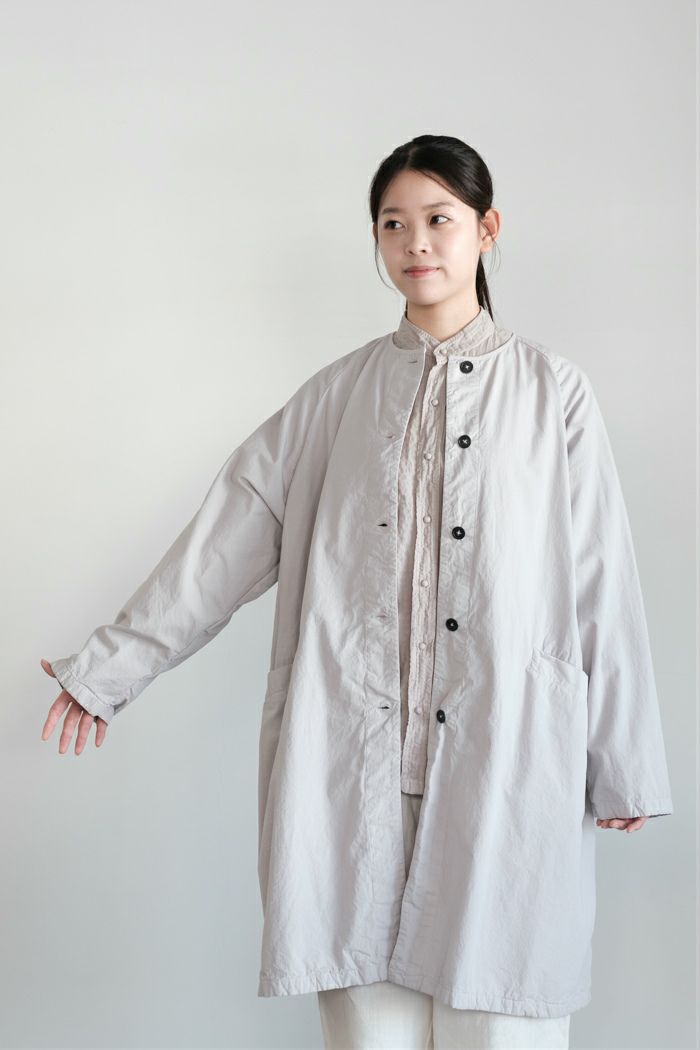 40番手のやや肉厚なポプリン素材に、 薄手のコットンボイル裏地を使用ています。 2重仕立てのなので、季節の端境期におすすめのコートです。 製品染めで仕上げています。