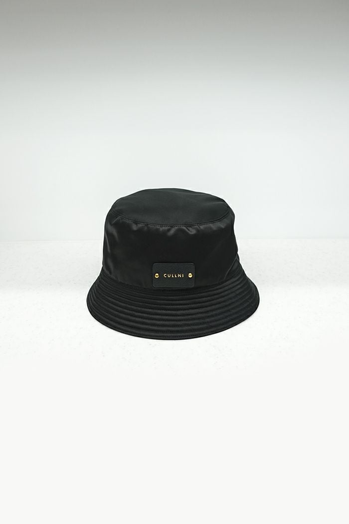 定番のバケットハット。 上品な微光沢のあるナイロン生地を使用しています。 サイドのレザーパッチにゴールドのスタッズで固定したCULLNIロゴ(ゴールド箔)が特徴的。