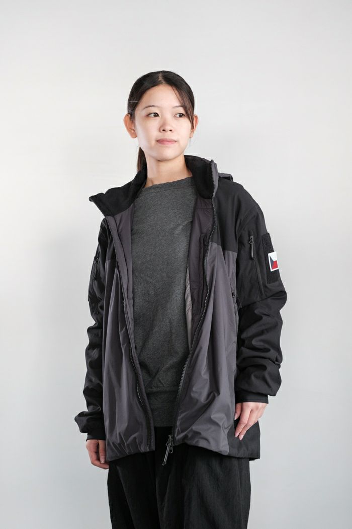 TMG仕様では肩から腕にかけてナイロンファブリックで補強。腕のポケットとベルクロループ面が追加されています。裾のドローコード調整位置もフロント寄りになり腰回りの装備に干渉しません。身体のラインに沿ってシェイプした細身のシルエット。ピタッとした着用感はありますが窮屈さは感じない絶妙なサイジングに。絶妙な生地厚ですので、アウターからミドルレイヤーまで様々なシーンに対応可能です。