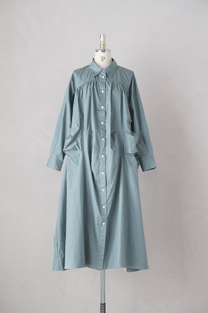ヨーク部分にもたっぷりのギャザーを入れてふわりと広がりを持たせたシャツワンピースです。
