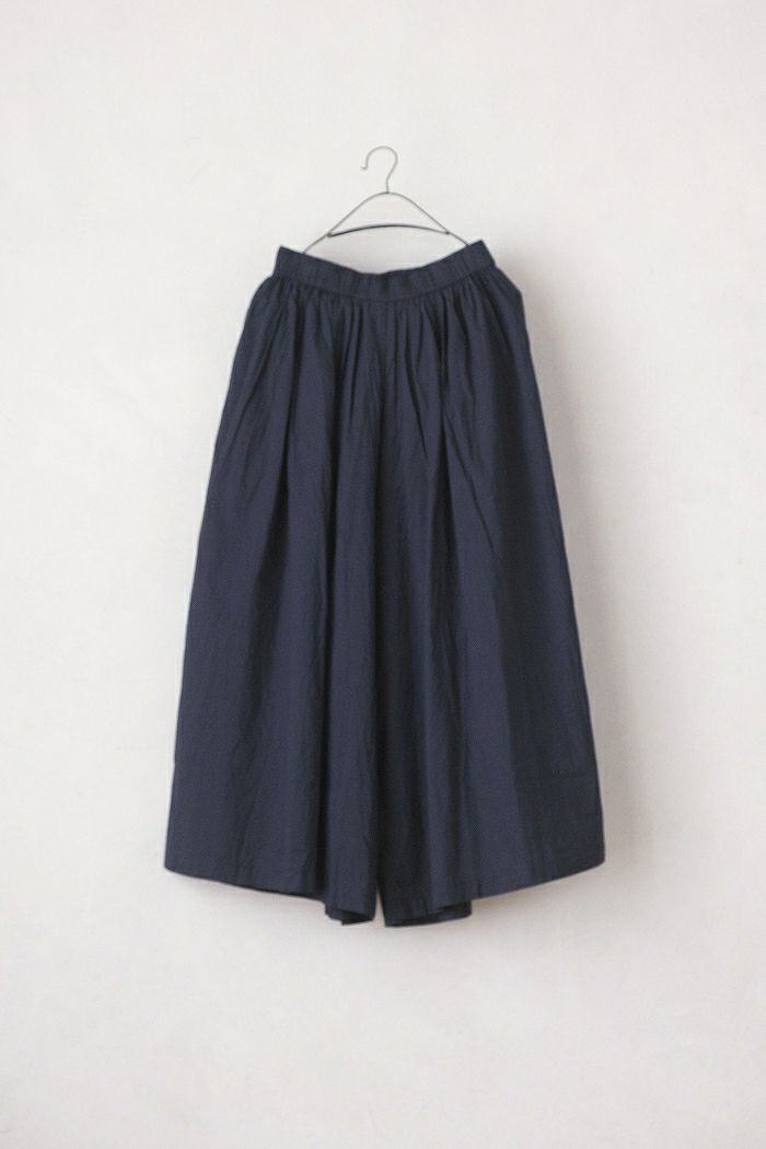 まるでスカートのようなボリュームのあるワイドキュロットパンツ。ウエストにたっぷりと入ったギャザーが、ふんわりとしたボリュームを生み出しています。
