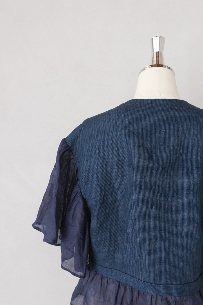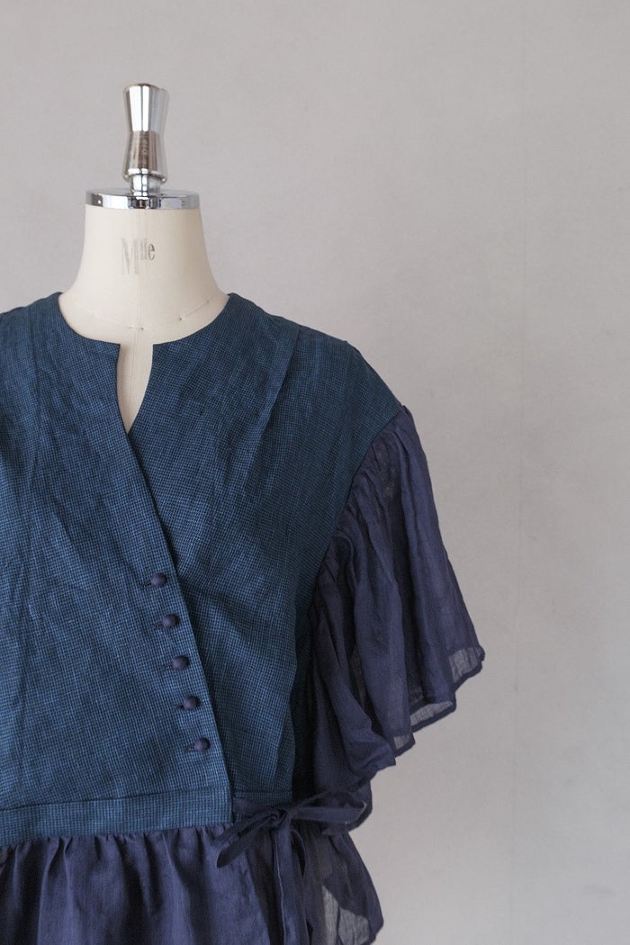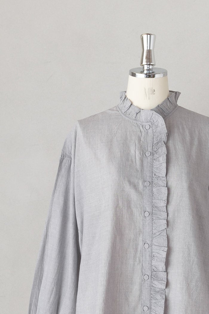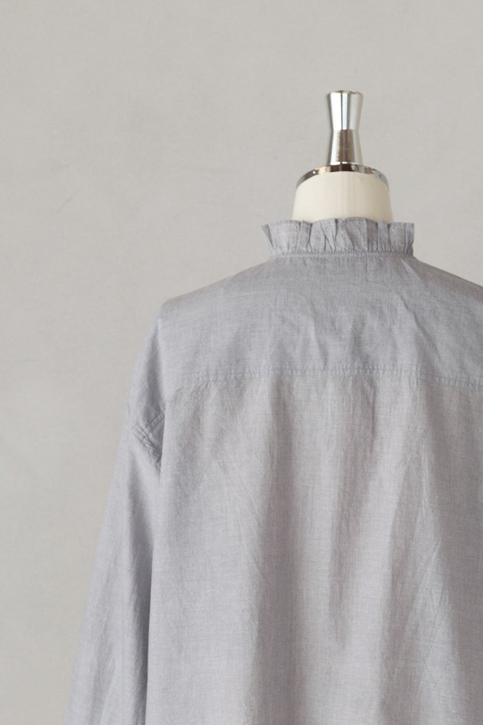他の画像を見る maison de soil メゾン ド ソイルHANDWOVEN YARN DYE CHAMBRAY FRILL COLLAR LONG SHIRTS(26SS) ¥ 30,800 税込 お気に入りに登録する
