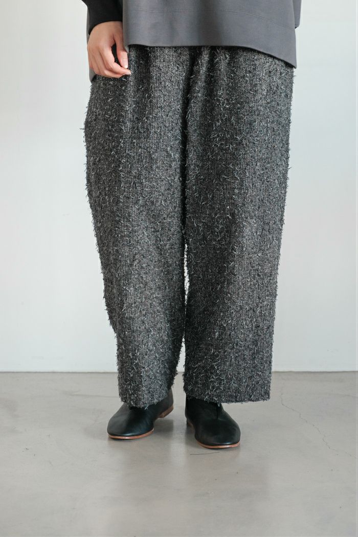 色調豊かなツイード生地にニードルパンチ加工を施し、モコモコとした独特な表情を描いた新作生地のタックパンツ。直接肌に触れても心地よい肌触りが特徴です。複雑に織り混ざった生地のカラー表情も魅力です。