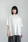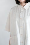 オーガニックコットン混の綿麻ポプリン生地を使用。 少量づつ丁寧に洗いこむ事で独特のシワ感に仕上がっています。 薄すぎず厚すぎずの程よい生地感で、 手触りがさらりとしており、 通気性がよく、暑い季節も快適な素材感です。