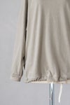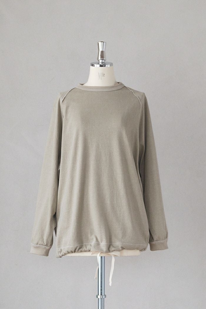 袖の縫い方を敢えて表裏逆にして、切りっぱなしが表側に見えるように縫い付けたデザイン。広めのアームホールでゆるりとしたシルエットは、着心地もよくデイリーに活躍するアイテム。裾の内側にある紐をきゅっと結んでバルーン上にシルエットの調節も可能です。