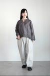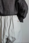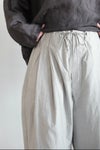 ウエストは、スピンドルの入ったゴムシャーリング仕様に仕上げ。ベルトのように、紐を見せるスタイリングもお勧めです。両サイドにスリットポケット、ヒップに両玉縁ポケットあり。裏地無し。
