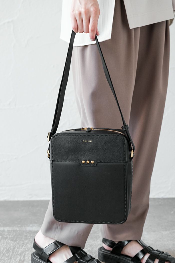 ゴールドの3スタッズがアイコンのCULLNIを象徴する定番アイテム、スクエアレザーショルダー。 長財布、500mlのペットボトル、キーケース、スマートフォンがきっちりと収まるサイズ。コンパクトながら実用性も十分です。 持ち手の長さは調節可能で、肩に掛けることもできます。