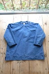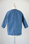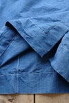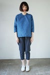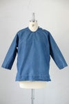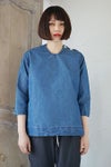 コットンポリエステルインディゴウェザーデニムで仕立てた肩ボタン開きのプルオーバーシャツ。超高密度ウェザークロスをインディゴ染めにしたオリジナルテキスタイルです。硬くてハリコシのある生地感で、表面はツヤのあるなめらかな風合い。サラッとした肌当たりで、ハリコシがありながら、着心地のよいしなやかさも併せもつ素材です。着る程に自然なアタリ感が生まれる独特の質感が魅力。左肩部分の2つボタンを開けて着るかぶりタイプ。首元はすっきり見えるUVネックです。ゆるめのボックスシルエットで、内側縫い代が総パイピング仕立ての一枚仕立て。カジュアルだけど大人っぽいモード感の漂うデニムシャツです。