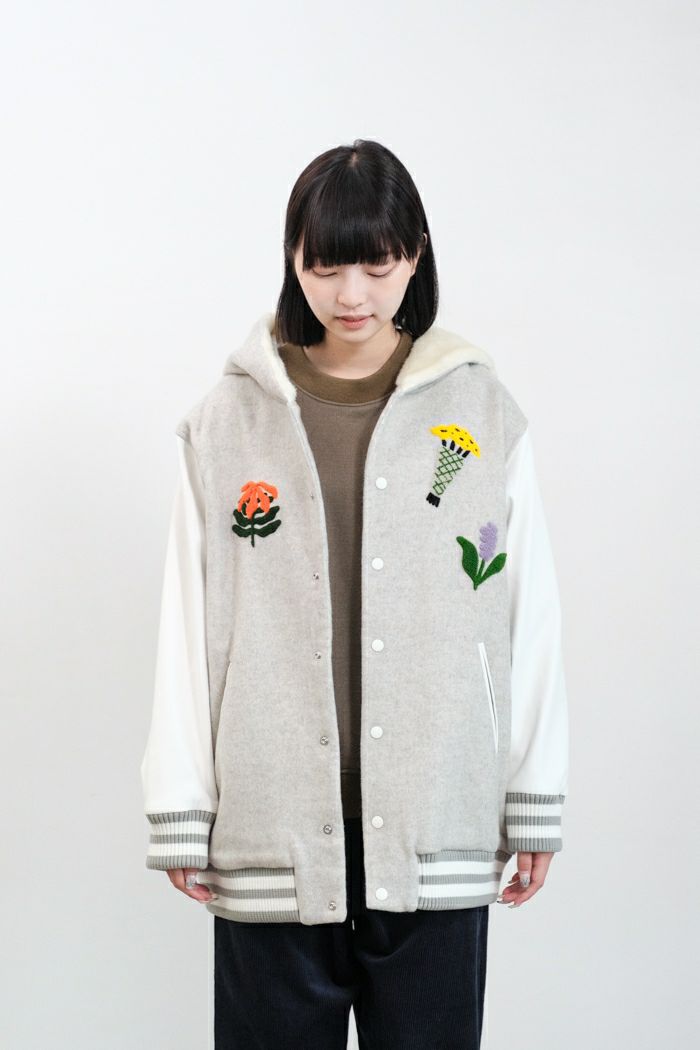 3つの花刺繍とフェイクファーのセーラーフードが目を惹くスタジアムジャケット