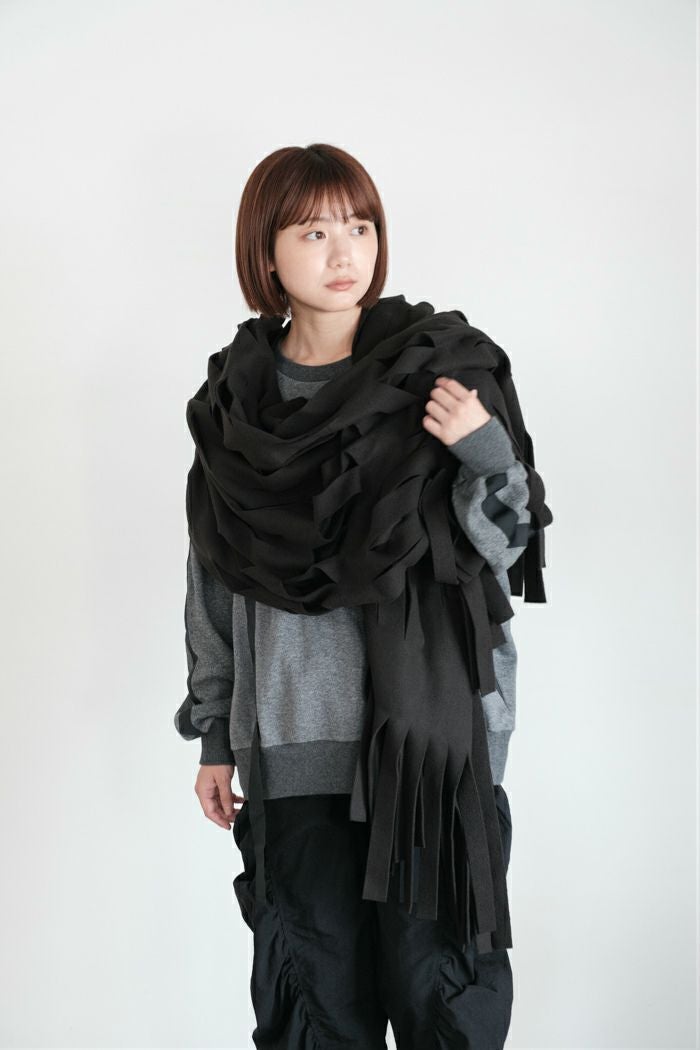 多数の切り込みがアクセントになる、存在感たっぷりのアイテム。 肩から羽織ったり首にぐるりと巻いたり、洋服に合わせて様々な着こなしを楽しめます。