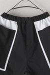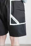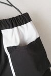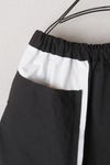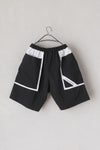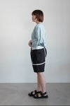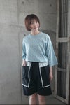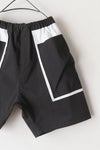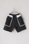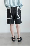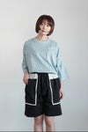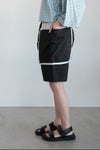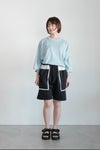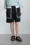 切りっぱなしの配色生地を挟み込んだデザインのポケットが目を惹くショートパンツ。
