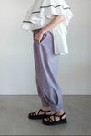 腰回りにゆとりを持たせ、裾に向かって緩やかに絞った「エッグシルエット」が、体型をカバーしつつこなれた抜け感のあるデザイン。