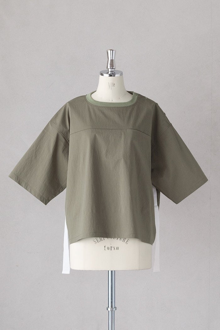 首元は左肩のスナップボタン開きのデザインで、すっきりとしたリブ仕様。
