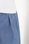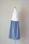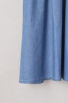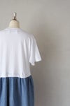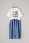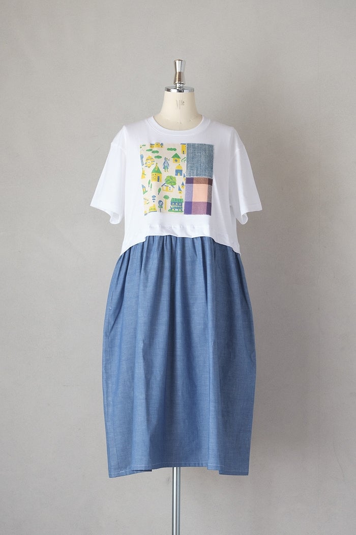上見頃はTシャツ素材、スカート部分はコットンシャンブレー生地を使用したコンビワンピース。スカートの右脇にスリットポケットが付いています。裏地なし。