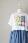 ラオス北部に住むタイドン族の女性が手織りで織った布や、おもちゃ作家mokuma制作による木版画をプリントした新作テキスタイル『sanpo』を使用したコラージュワンピース。