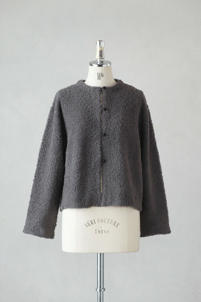 軽くて暖かなブークレーニットのジャケット。 チクチク感のないふんわりとした柔らかな素材感で、 これからの寒い季節に手放せなくなるアイテムです。 寒い季節に優しい素材に包まれる幸福感と安心感を、 存分に味わっていただきたいという、デザイナーの想いが込められ一着です。