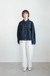 インディゴの持つ素朴で豊かな表情と、 間隔をあけて配置した微光沢のあるミニマルな刺繍柄の組み合わせが、 どこか懐かしさを感じるノスタルジックな雰囲気を醸し出しています。 まるで古着のような、温かみのある風合いが魅力の1着。