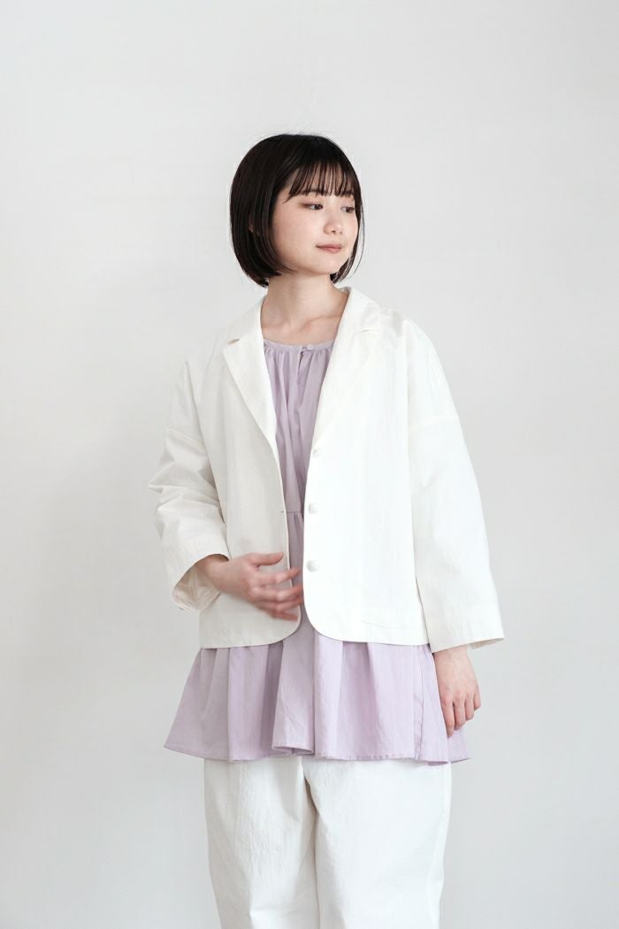 短めの着丈なのでワンピースの上にもバランスよく羽織れて、 長めのシャツなどに重ねてレイヤードも楽しんでいただけます。 前裾は女性らしいラウンドカット。 大きめのくるみ釦がポイントになっています。 インナーを調整しながら、長く愛用いただける一着。 同生地のテーパードパンツとセットアップもおすすめ。 ポリエステル総裏付き。