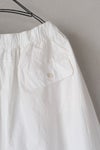 ウエストは総ゴム+紐で調節できるデザイン。両サイドにスリットポケットあり。ヒップにフラップポケット付き。裏地無し。