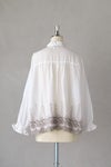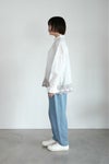 上品なミニフリルのスタンドカラーがポイント。 袖口はゴム入りフリルでふんわりとしたシルエットになります。 ゆったりとした身幅で着心地よく。 ジャケットなどのインナーにも使いやすいデザイン。