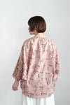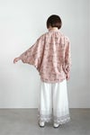袖から身頃にかけてゆったりとしたドルマンスリーブの8分袖。 ゆるりとしたリラックス感のある着心地。 前開きデザインなので、 ブラウスとしてはもちろん、 軽い羽織りとしても活躍します。 重ね着次第で季節を問わず着用できるのも魅力。 コーディネートの主役になる、遊び心のある一枚です。