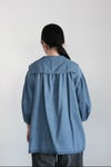 フロントはスクエアカラー、後ろはセーラーカラーのデニムブラウス。 後ろヨークと5分袖にキャザーを入れたパフスリーブのアイテムです。パーツパーツが大胆なシルエットの、ボリューム感のあるデニムブラウスです。