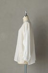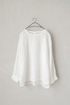 風通しのよい太めの袖口に、太めの緩いゴムを入れギャザーを入れたワンポイントのあるデザイン。背中にボックスタックを入れ、裾に向かってゆったりと広がるワイドシルエットです。