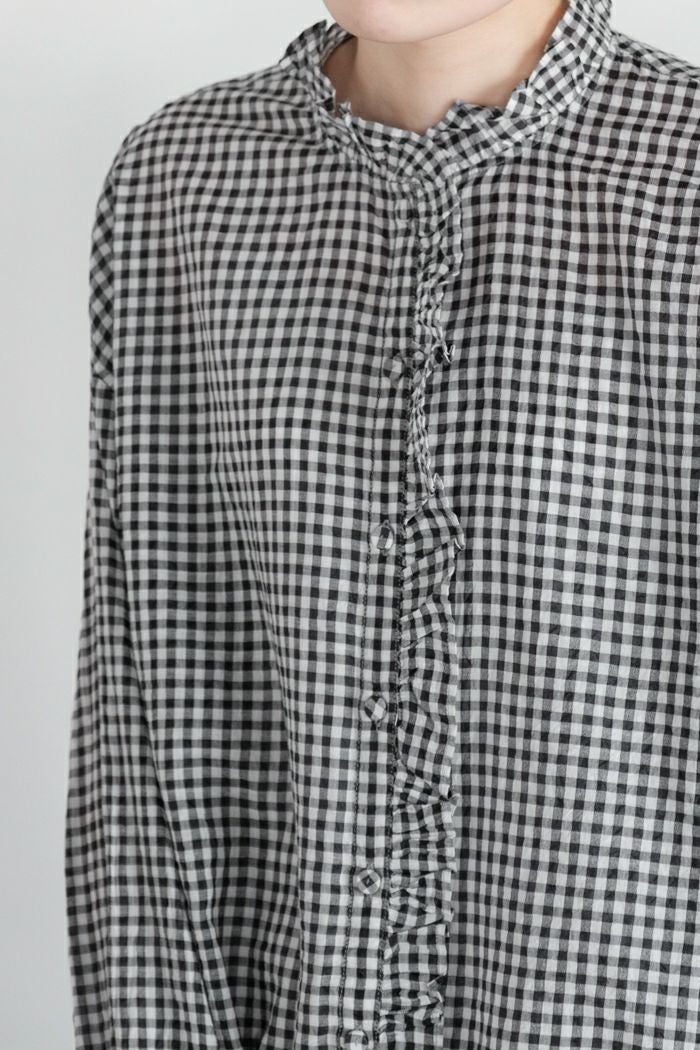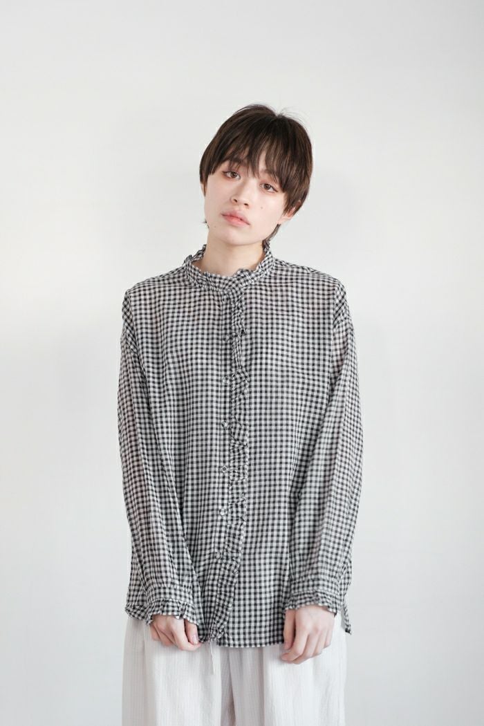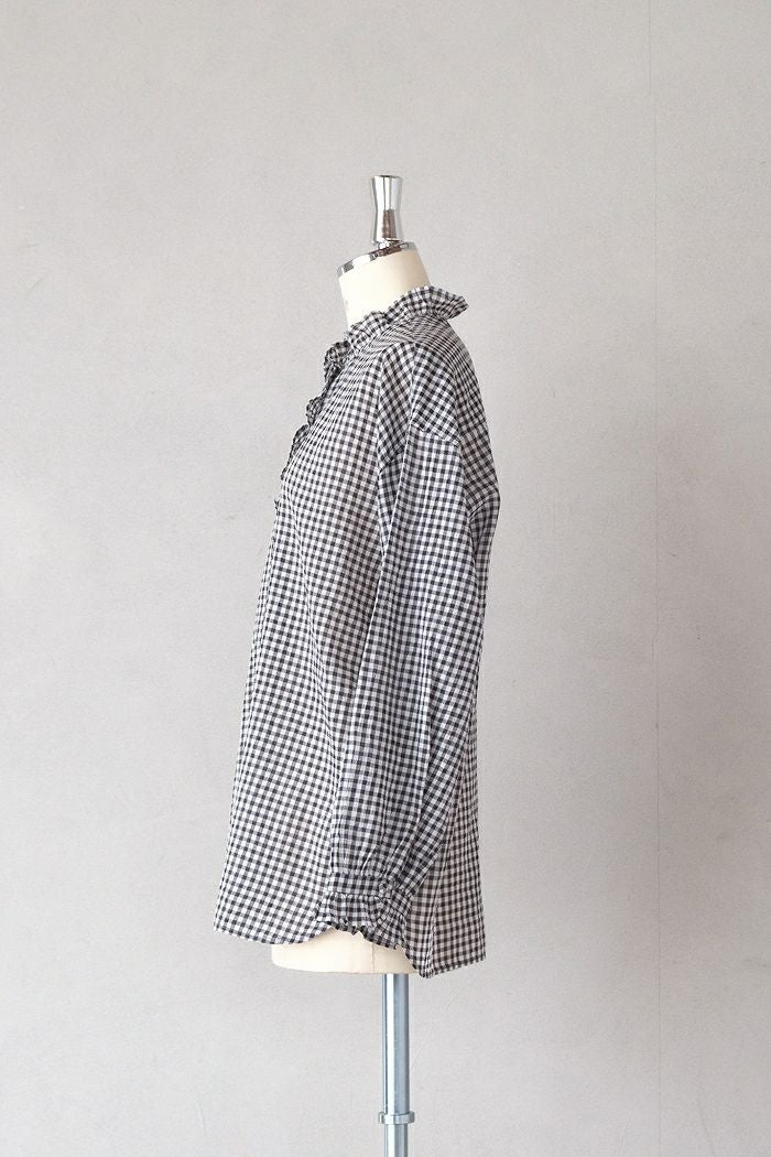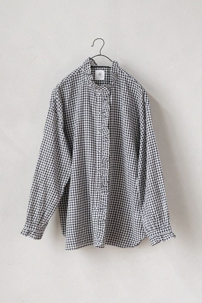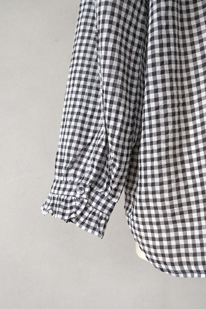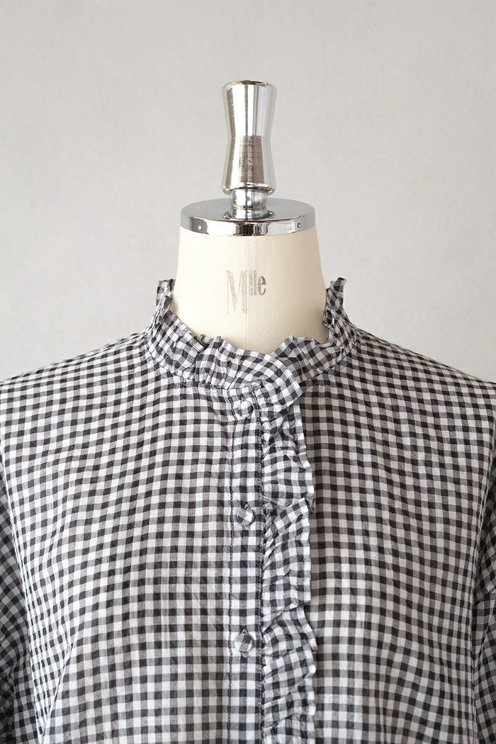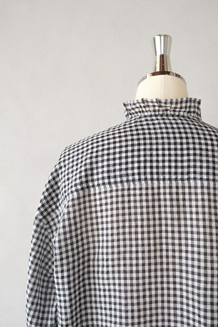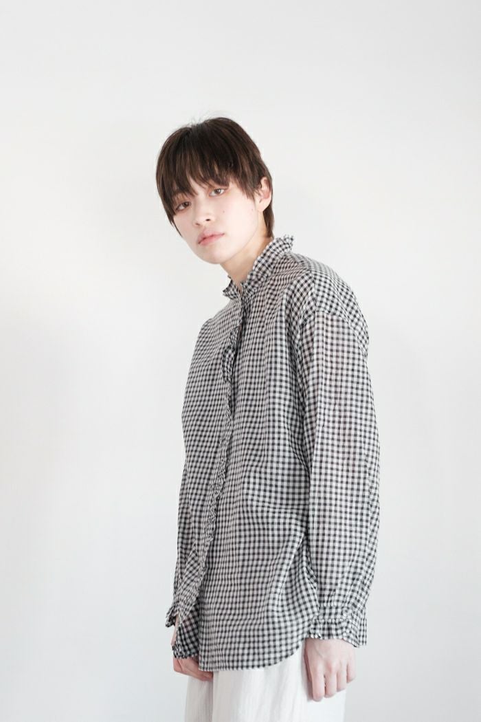 他の画像を見る maison de soil メゾン ド ソイルHANDWOVEN COTTON/SILK GINGHAM CHECK FRILL COLLAR SHIRT(25SS) ¥ 28,600 税込 SOLD OUT 再入荷お知らせ お気に入りに登録する