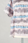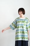 Tシャツ型で着やすいプルオーバータイプのブラウス。 Tシャツ感覚で着回せる気安さがうれしいデザイン。 襟ぐりのホワイト切り替えがさわやかな印象を与えています。 ゆったりとした身幅のドロップショルダー。 袖丈は5分袖くらいになります。左胸ポケットあり。