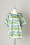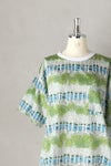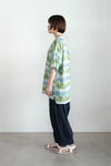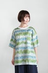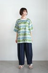 Tシャツ型で着やすいプルオーバータイプのブラウス。 Tシャツ感覚で着回せる気安さがうれしいデザイン。 襟ぐりのホワイト切り替えがさわやかな印象を与えています。 ゆったりとした身幅のドロップショルダー。 袖丈は5分袖くらいになります。左胸ポケットあり。