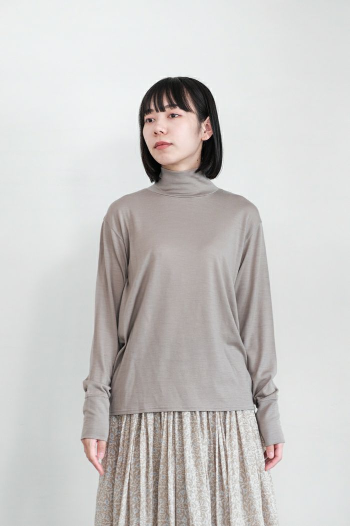秋冬のコーディネートに欠かせないインナーアイテム。 すっと立ち上がったモックネックがデザインポイント。 袋状のゆるめハイネックなので柔らかな表情があり、 首回りが締まりすぎず、ハイネックの苦手な方にもおすすめです。 手の甲に被るロング丈の長袖で、袖口には親指ホール付き。 アウターの袖口から覗かせるコーディネートが新鮮。