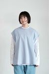 太めのコットンリボンを施し、 ワークウェアのようなラフな雰囲気をプラス。 前後どちらを前にしても着ていただける2WAYデザイン。 ゆったりした身幅とアームホールで、 通年通して重ね着を楽しめるアイテムです。 夏はブラウスやTシャツの上におすすめ。