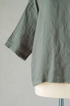 身頃は薄手のリネン布帛ですが、 衿ぐりをコットンリブのバインダーネックで切替えたカジュアルなデザイン。 Tシャツのように着ていただけるリネンシャツです。 ゆったりとした身幅で、 肩が自然にドロップするワイドシルエット。 風通しのよい太めのシルエットです。
