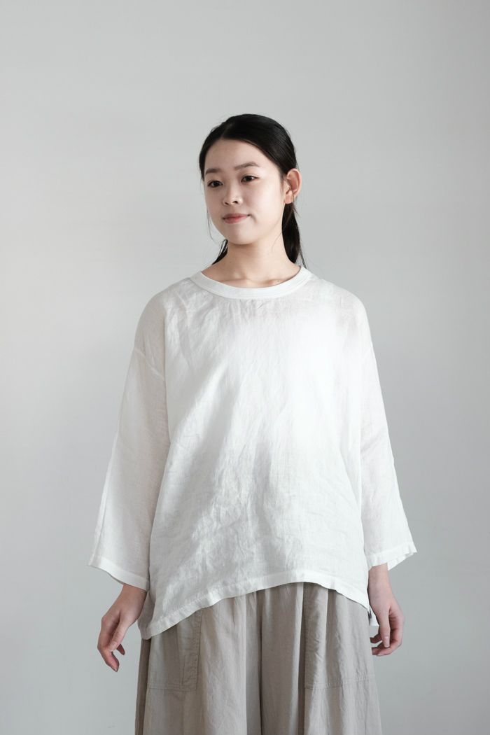 身頃は薄手のリネン布帛ですが、 衿ぐりをコットンリブのバインダーネックで切替えたカジュアルなデザイン。 Tシャツのように着ていただけるリネンシャツです。 ゆったりとした身幅で、 肩が自然にドロップするワイドシルエット。 風通しのよい太めの8分袖です。