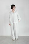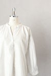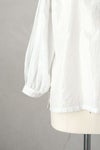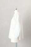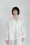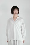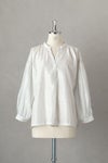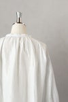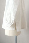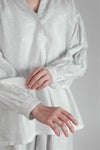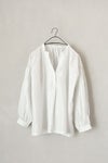 フロントは深めのVネックで、1つボタンで留めるデザイン。襟周り、カフス部分、アームホールにたっぷりのギャザーをとった柔らかい雰囲気のシルエットです。