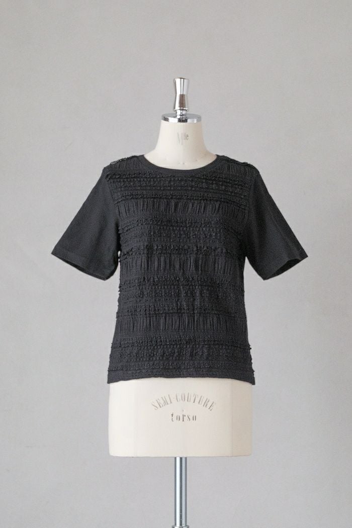 フロント全体にティアード状にレースをあしらったTシャツ。 レース部分には、繊細な極細の糸を使用し、 数種類のレースや編地を組み合わせたこだわりの素材です。 後ろ身頃と袖はコットン天竺素材。