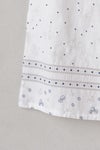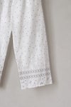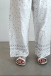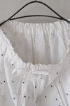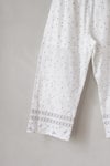 生地同色の刺繍糸で施した刺繍の中に、 部分的に配色の刺繍糸を入れてアクセントをつけたアイテム。 裾にあしらわれた繊細なボーダー模様は、足元をすっきりと見せてくれるアクセント。