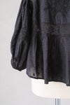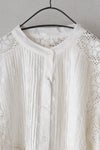 胸元に細かく施されたピンタックと、背中に同色糸で施された華やかなモチーフ刺繍が目を惹く1枚。肩、袖、前後のモチーフ切替え部分をレースであしらった贅沢なアイテム。ボリュームのある袖はふんわりとリラックス感あるスタイリングに。袖口にゴムを入れ、ブラウジングも可能です。
