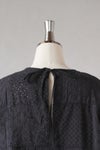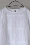 繊細な刺繍レース生地をパッチワークで組み合わせたブラウス。 素朴なコットンの風合いと、 どこかレトロな雰囲気のあるデザインが魅力。 後ろ襟ぐりのスリット明きとリボン結びがポイント。