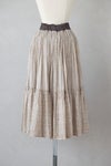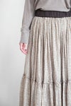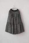 ふんわりと空気を纏っているようなたっぷり生地を使用したギャザースカート。 さりげなくキラッと光るラメ糸がライン状に織り込まれた繊細な奥行きのある生地感が魅力です。 インドの昔ながらの手法である手捺染でのスクリーンプリントで一色一色、色を重ねてプリントされており、手仕事による温かさを感じることが出来ます。