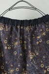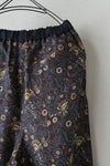 ウエストは総ゴム+紐で調節できるデザイン。ウエストは紺色の別布でアクセントになっています。パンツの両サイドには紺色の玉縁パイピングを入れ、品のある雰囲気に仕上がってます。 両サイドにポケット、ヒップに玉縁ポケット1つ付き。裏地無し。