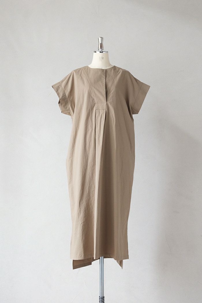 フロントをボックス折にして、スカート部分にふんわりとしたフレアが生まれた1枚。首元は1ボタンで、きちんと感のある首元を演出しています。袖は、二の腕を優しく隠してくれる半袖で、やや大きく開いているので重ね着もしやすいシルエット。