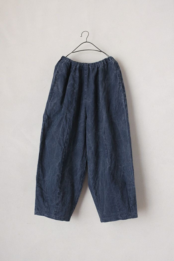 裾にダーツを入れることですっきりとさせた 裾窄まりのデザインはトップスとのバランスも取りやすいアイテム。 ウエストはオールゴムと紐でサイズ調節ができ 腰回りもゆったりとしたリラックスした履き心地です。