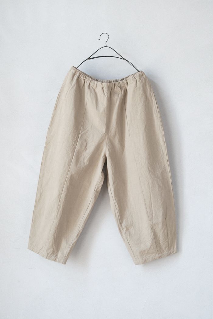 ウエスト総ゴム&紐入りのイージー仕様。 裾にタックを入れて前後4枚ハギで仕上げた、 ぽわんとした立体的なシルエットが特徴。 股上が深くてとてもリラックス感のある穿き心地です。 ヒップのパッチポケットもさりげなく可愛い。