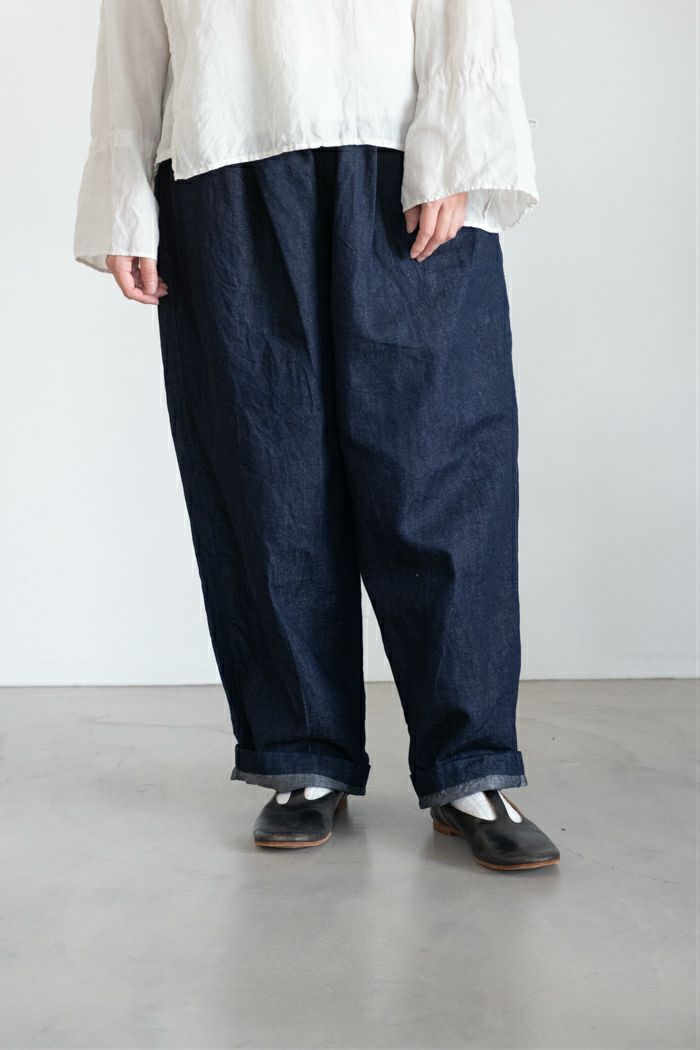定番のコットンリネンデニムのカンフーパンツ。 程よいハリ感と柔らかさを備えたコットンリネンのデニム生地です。 カジュアルからキレイめまで、 幅広いスタイルにマッチするデニム素材のパンツは、 日々のコーデに欠かせない一本です。