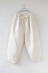 Laboratoryの定番”カンフーパンツ”。 きれいなシルエットとリラックス感のあるパターンが人気の理由です。 ウエスト総ゴム入り&綿テープのドロー紐付きで、 とても穿きやすいパンツ。